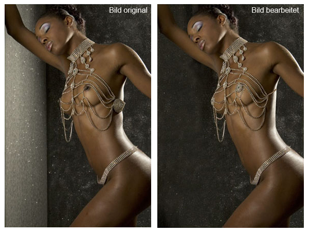 Der Modeschmuck wurde einfach mit Bildbearbeitung umdesignt. Sichtbare Hautunreinheiten am Oberschenkel