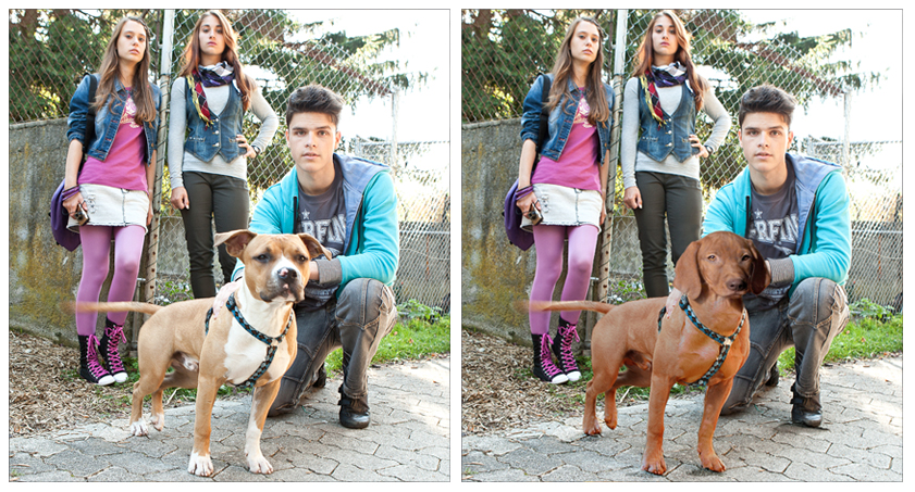 | Fotoshooting mit Kindern und einem Welpen für ein Jugendmagazin. Leider stellte sich bei der Abgabe heraus, dass der nette Welpe ein verbotener Kampfhund ist. Was tun? Es eilt, da der Drucktermin fest steht. Eine Retusche kann in letzter Minute alles retten. |